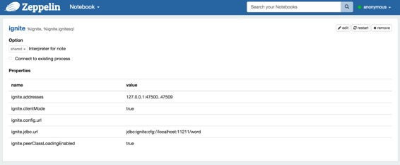 在“解释器”菜单中,您可以编辑Ignite解释器或创建新的。Zeppelin提供了Ignite的这些属性。