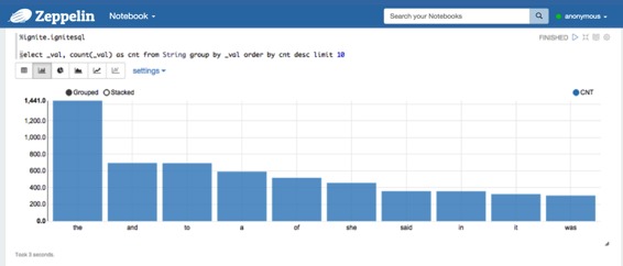 假设您正在运行org.apache.ignite.examples.streaming.wordcount.StreamWords,那么您可以使用“单词”缓存(当然,您必须将此缓存名称指定给ignite.jdbc.urlZeppelin 的Ignite解释器设置部分)。例如,您可以使用以下查询在单词缓存中选择前10个单词