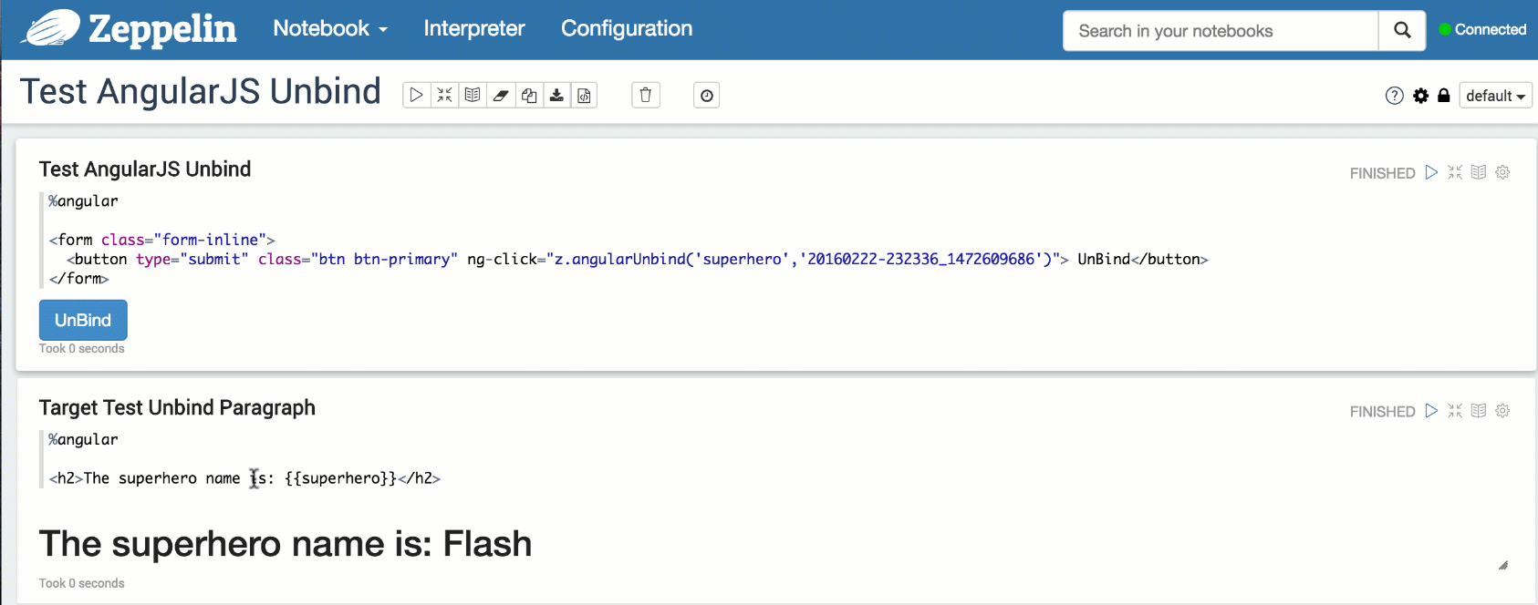 Destroy binding(破坏绑定) z.angularUnbind(var, paragraphId) z.angularUnbind(var)