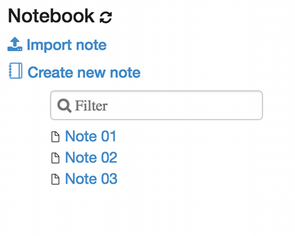 您可以使用输入文本形式通过名称过滤它们。您还可以创建一个新的笔记,刷新现有笔记的列表(万一手动将其复制到$ZEPPELIN_HOME/notebook文件夹中)并导入笔记。