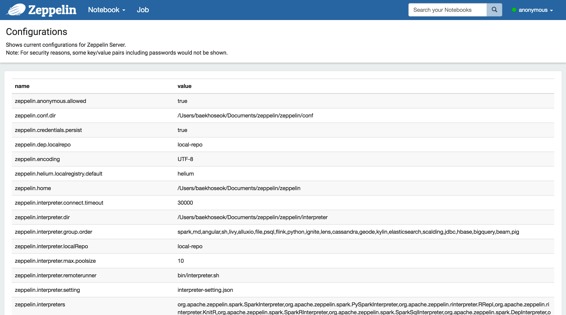 此菜单显示配置文件中设置的所有Zeppelin配置 $ZEPPELIN_HOME/conf/zeppelin-site.xml
