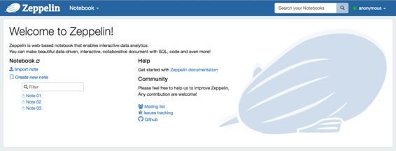 你第一次连接到Zeppelin,你将会在主页面上看到下面的截图。